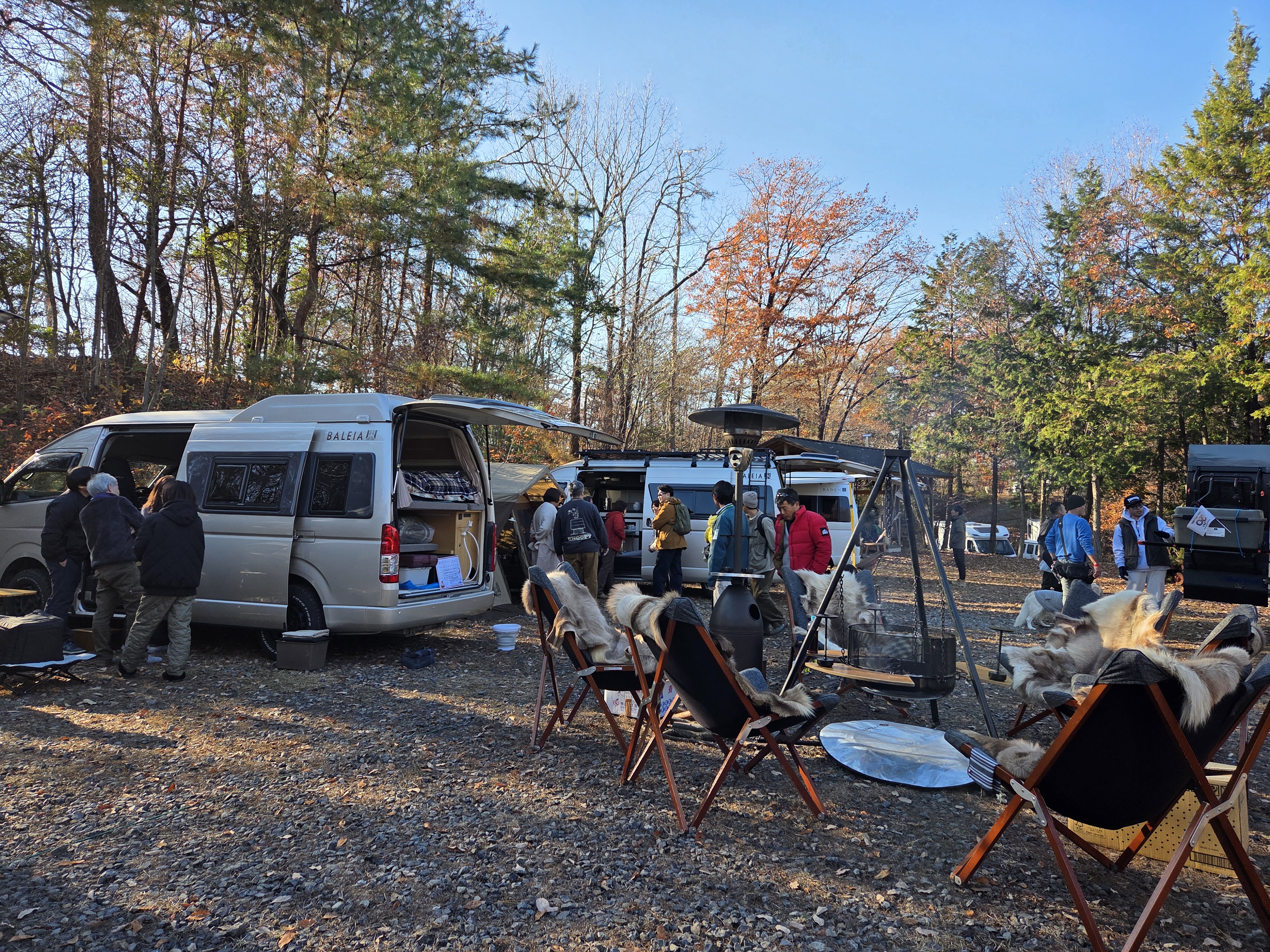 家族構成や参加する年代によっては大きなテントも快適です。2台のキャンピングカーの間にテントを設置。