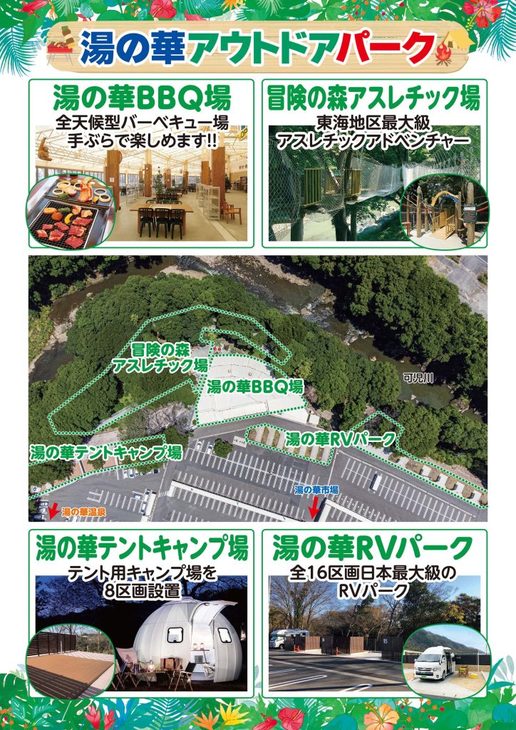 木曽川のほとりで、温泉も市場も満喫できる「1日遊べるRVパーク」です。