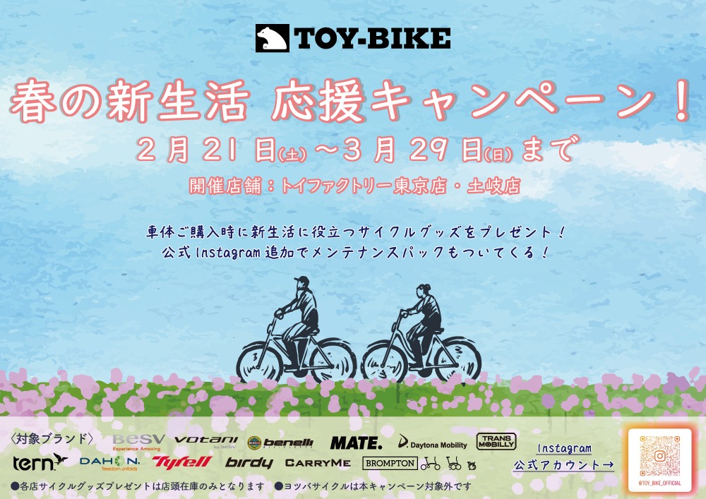 現在、TOY-BIKE各店では、新生活をスタートする皆さまをバックアップするキャンペーンを開催中です!