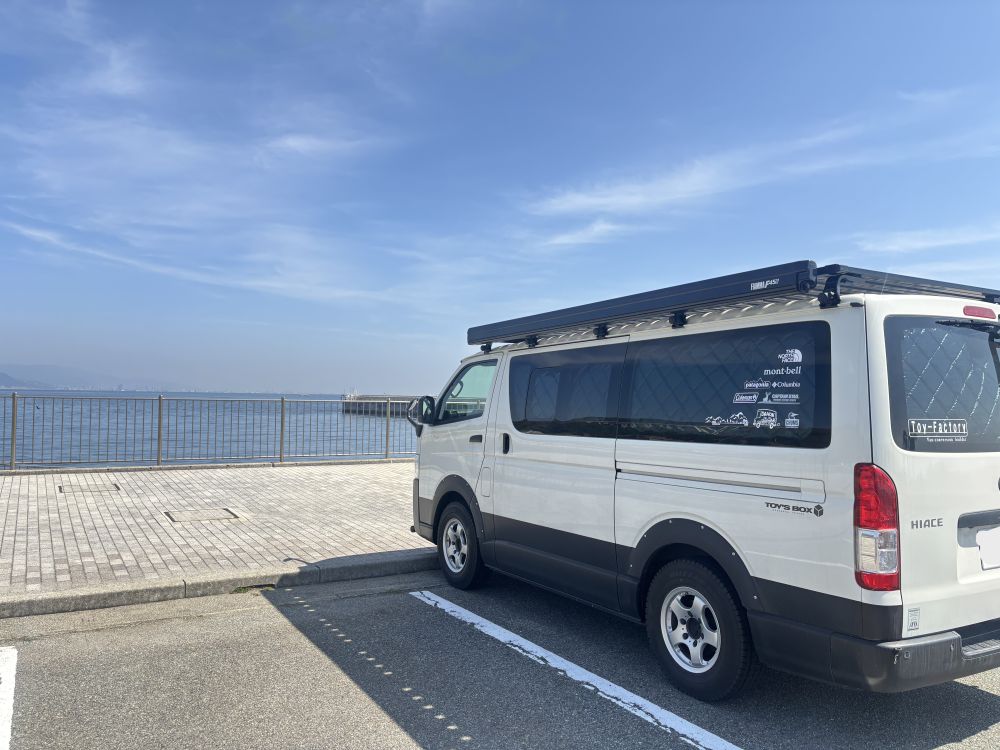 施設の駐車場が2.1mで高さ制限の壁が💦困っていたところ、気前のいい漁港のおっちゃんが港の駐車場を貸してくださいました🐡