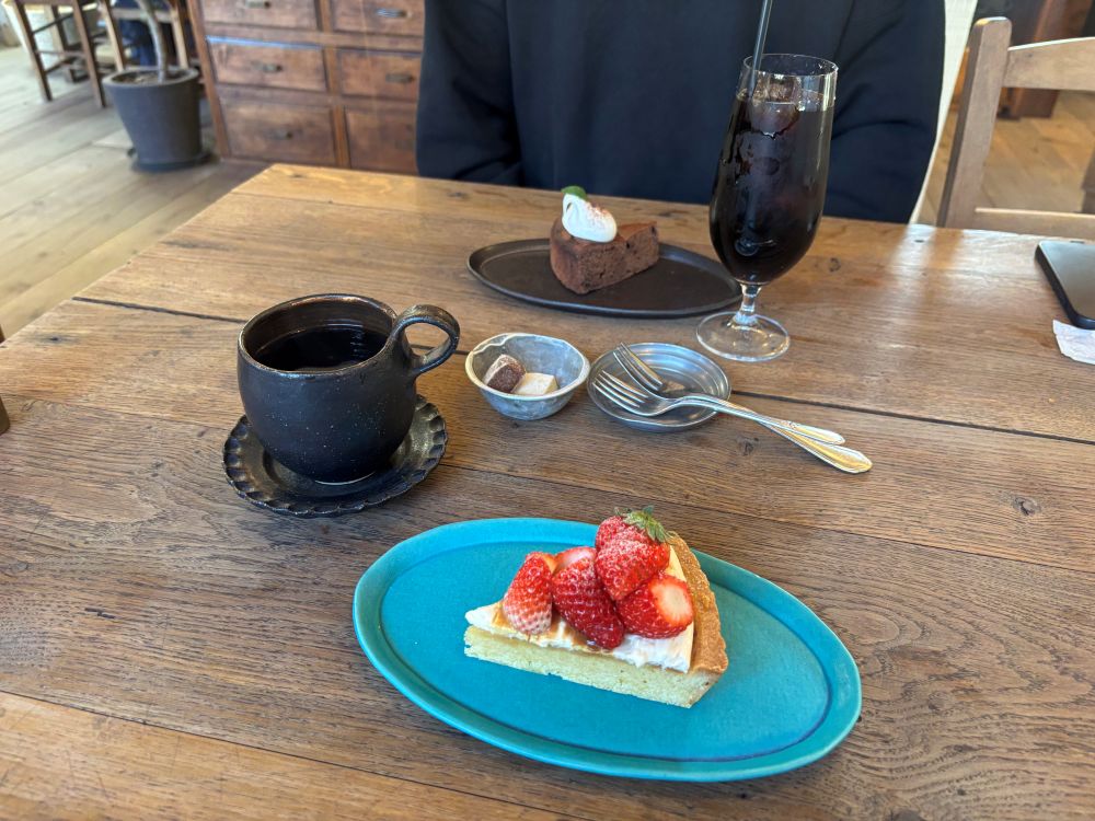 ちょっと休憩、で喫茶店へ。のんきなまっちゃんと相方は旅中時間を気にしていないので夕方17時でもケーキを食べます🍓