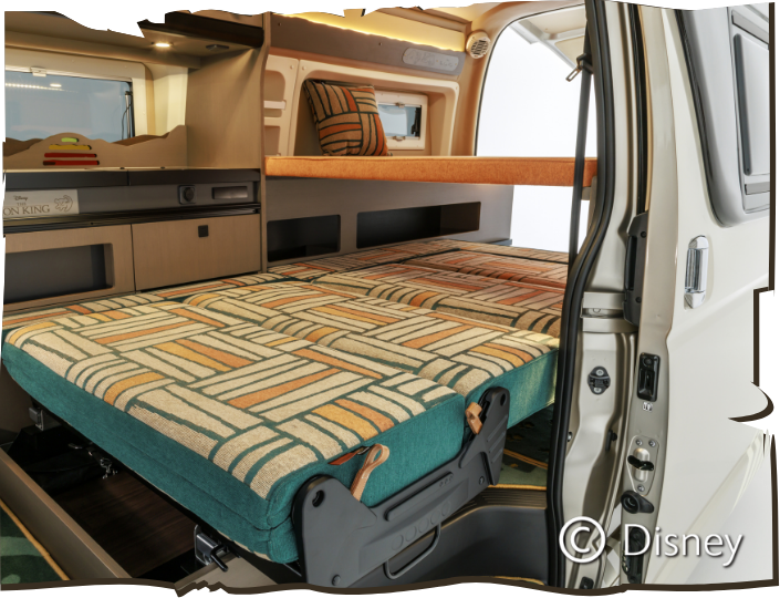 大人3名が就寝できる常設のリヤベッドは、太陽の光を一面に浴びたオレンジの大地の色を表現。『ライオン・キング』デザインキャンピングカーのために、尾州織で特別に織り上げた限定ファブリック。