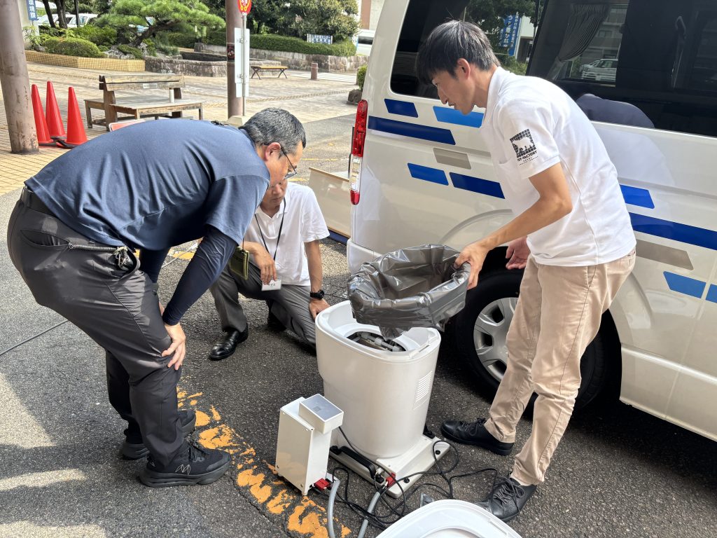 「clesana(クレサナ)」は、災害時や車内で安心して衛生的に使えるトイレです。水を使わず、化学薬品も一切使わないため環境に優しく、防臭・防水された高品質なフィルムで使用毎に自動密閉するため、臭いもなく衛生的です。能登半島地震の被災地で支援派遣したクレサナが大活躍し、被災地の方々に大変喜んでいただきました。