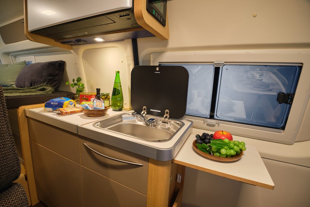 4名がくつろげるダイネット、立って調理できるキッチンスペース、水を使わないトイレ「クレサナ」を搭載したマルチルーム、2名が就寝できるリヤベッドを配置した、大人の2人旅に最適なモデルです。
