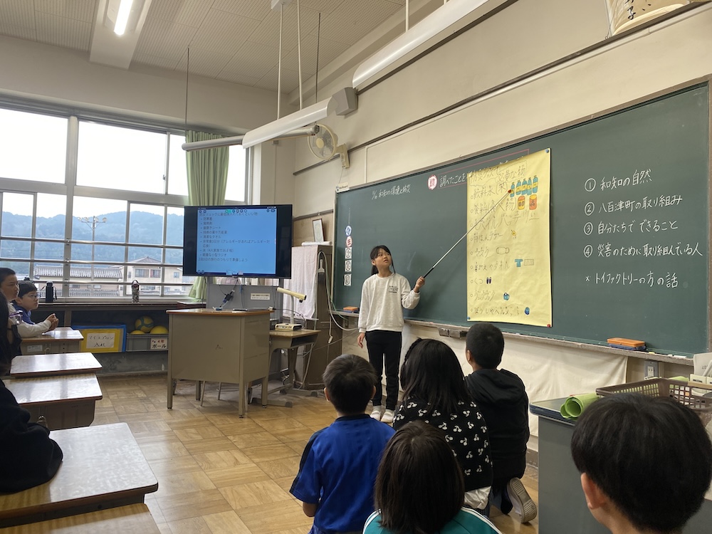 今回和知小学校の4年生は、八百津町の災害対策やハザードマップ、防災アイテムについて調べ、発表してくれました。