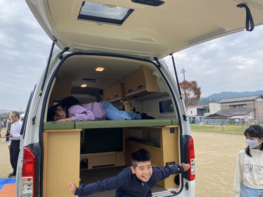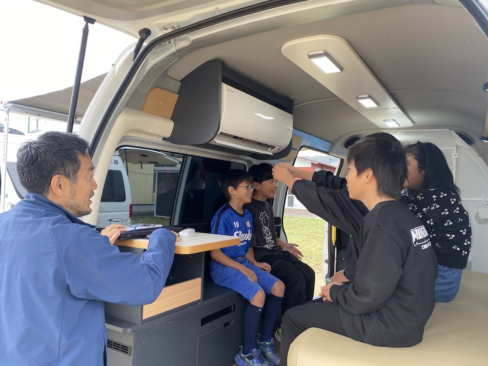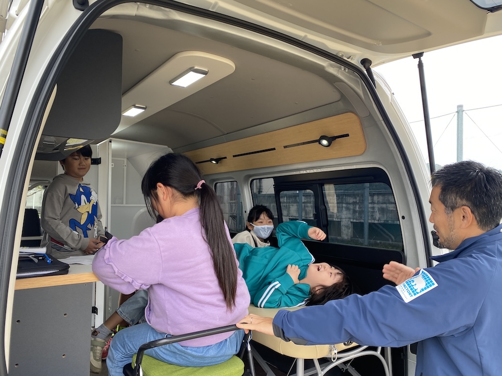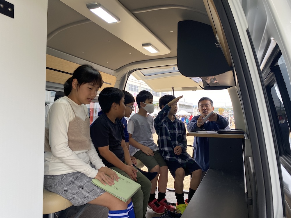 グランドでは車内見学がスタートし、災害時にも役立つ機能を体験してもらいました。