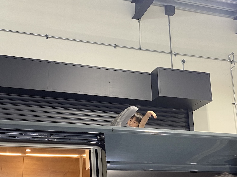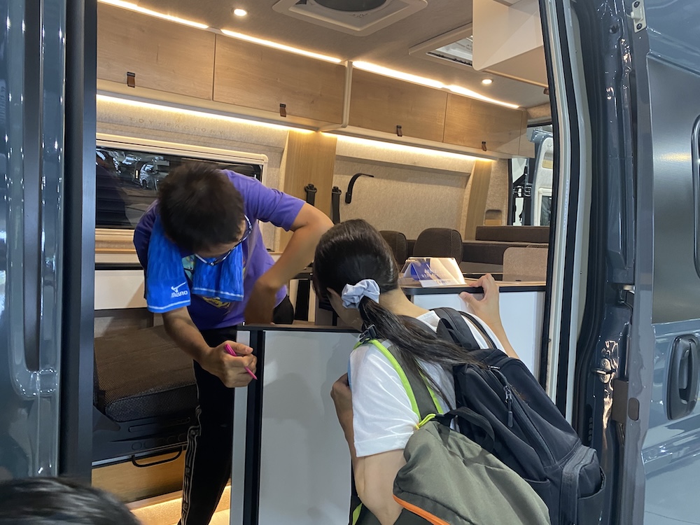 本社工場に到着した子どもたちを迎えたのは、大きなキャンピングカー!