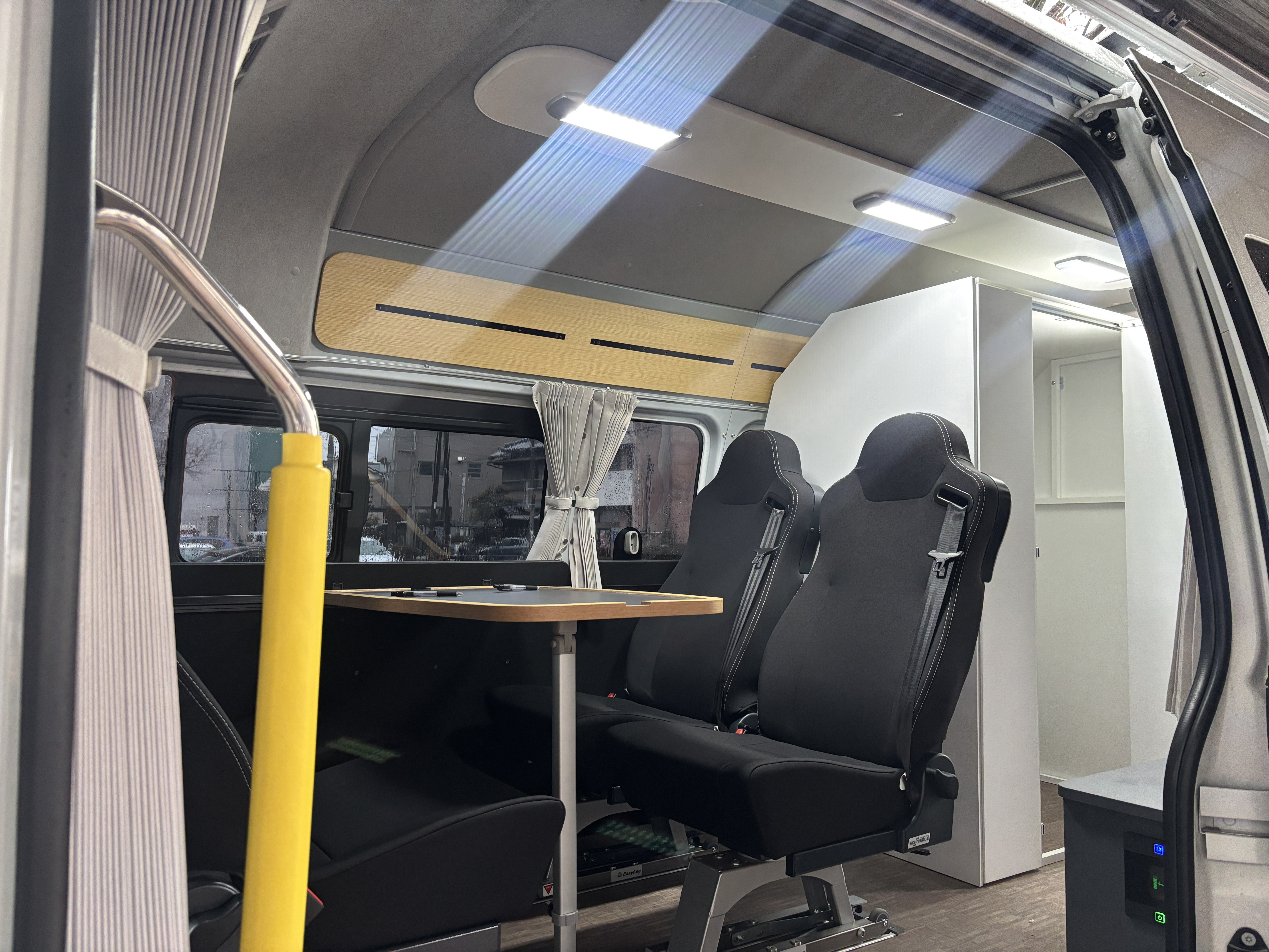 MARU MOBI(マルモビ)は、トヨタ・ハイエースや軽自動車をベースに、取り外し可能な脱着式シートや家具を組み合わせることで、用途に応じたレイアウト変更を可能にした多目的車両です。「備えない防災」という考え方を形にしています。
