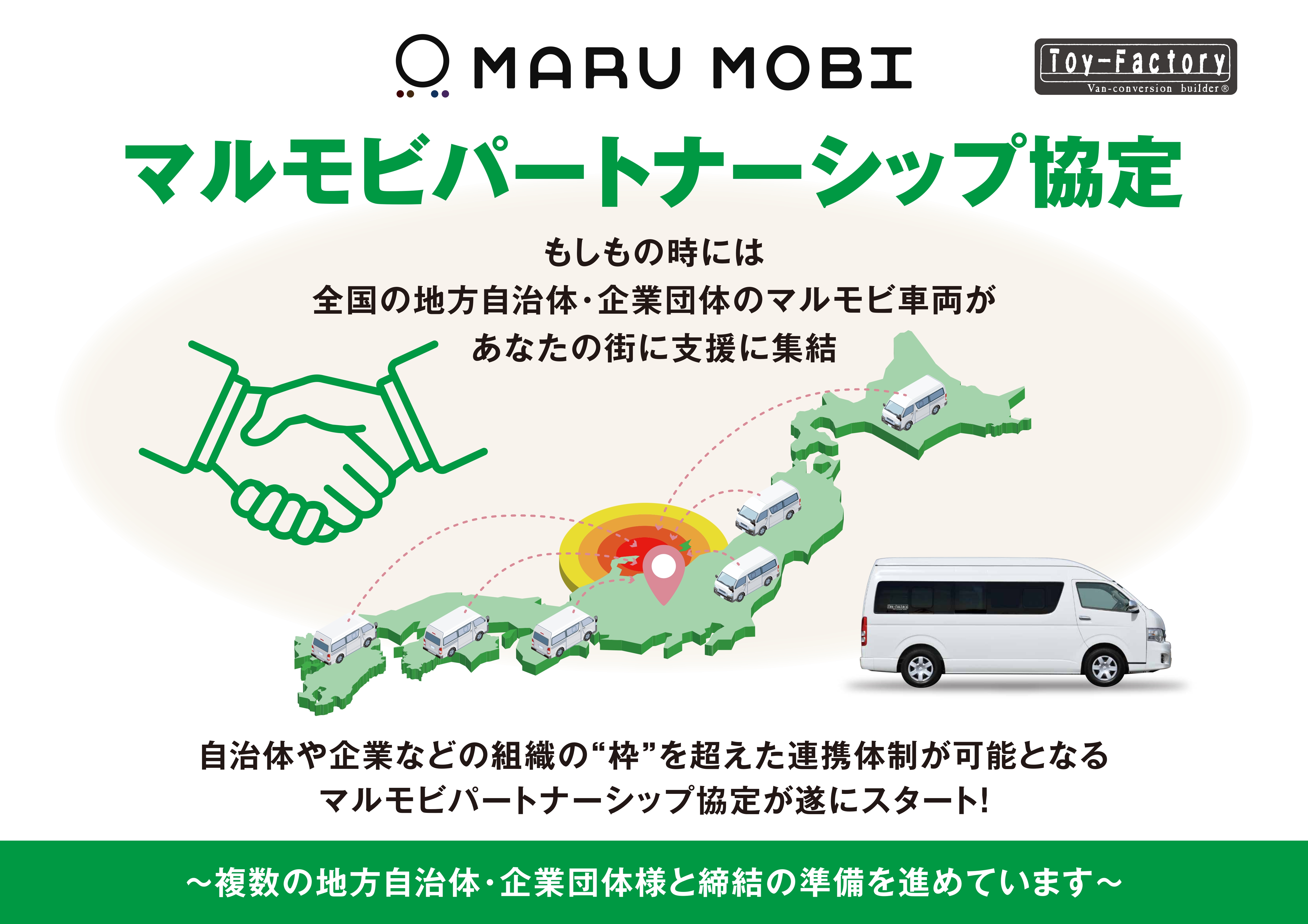 「マルモビパートナーシップ協定」は、災害などの有事において、協定を締結した自治体同士が保有するMARU MOBIを相互に提供し合うことを目的とした取り組みです。