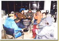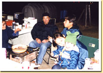 二次会は、今後「CLUB TOY」を取りしきってくれるであろう小西隊長のご自慢のテントでポカポカ気分(出窓付きで、本当におうちの様なテントでしたよ。)深夜1:00まで続きました。翌日、ねむそうな親たちを後目に又元気よく走り回る子供達でした。 |