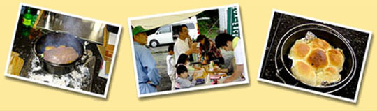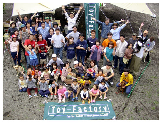 小西隊長の魔法の車からは、色々な道具が次々と出てきます。初日のおやつにパンづくり。計り・ボウル・タイマー・砂糖・粉・ダッチオーブン等等が魔法の部屋から出てきて、「パン作るよ?」のかけ声で子供達が集まり楽しいパン作りのはじまりです。みんなでコネコネ。出来上がりも写 真の通り大成功!! 夕食では、巨大なローストビーフ登場。これもまた隊長の魔法の冷蔵庫から出てきて、魔法のダッチオーブンで待つ事1時間。全員で食べたらあっという間になくなってしまいました。おいしかった?。実は、ローストビーフのソースを作ったのは、TOYの社長で、まわりに色々聞きながらコツコツ・グツグツ作っていました。だからよけいに美味しかったのかな?。(あくまで本人の感想) 大人ばかりではなく、子供たちも今回大勢の参加で、子供界の隊長を自分達でつくり、小さい探険家がいっぱいでした。「隊長、毛虫を発見しました」とか「隊長あっちに行ってみましょう」とか聞いてると、とってもおもしろい会話で、まさに子供ワールドがそこにありました。 楽しい時間はあっという間に過ぎてしまうもので、今回の2日間もぼちぼち終了となりながらも、まだまだ話足りなさ気な大人たちは、おいしいお寿司屋さんの情報交換でまだまだ盛り上がっていました。 子供達も「まだまだ遊びたーい」と暴れる子や、別れを惜しんで泣いてしまったりと、よっぽど楽しかったんだなーと思わせます。又ぜったい会おうねと約束を交わして、みんな帰っていきました 。