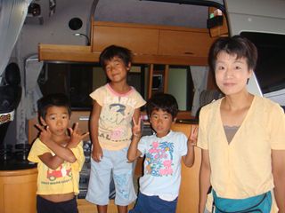 岡山県総社市の自宅を6時半、今日の宿泊予定は新潟。(左から長男・長女・次女・妻) 前日に、給水やサブバッテリーの充電済み。 |