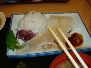 私は雑誌で見たイカ刺し定食。1200円。新鮮なイカが、まったりのコリコリで、うまかった。妻は刺身定食、長女と長男はイクラ丼。