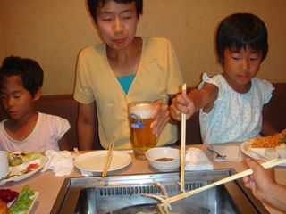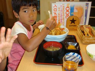 妻はビールに御満悦。子供たちは、お子様ランチ。父ちゃんは・・・やっぱり、肉。この日は、ビール園の駐車場泊。駐車代一晩3600円。