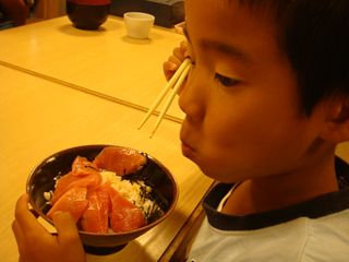 いつもの食堂へ。店名は知らない。マグロの大好きな長男はマグロ丼。長女もマグロ丼。760円。次女はなぜかジンギスカン丼。780円。