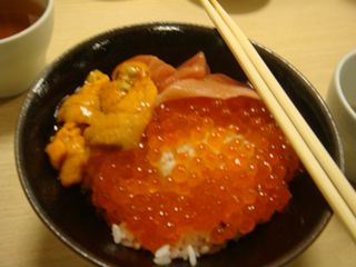父ちゃんはウニ・イクラ・マグロの三色丼。1880円。やっぱり生ウニはたまらん。イクラは大きくぷちぷち。マグロはとろける。
