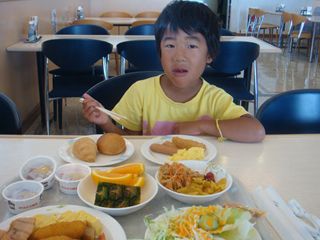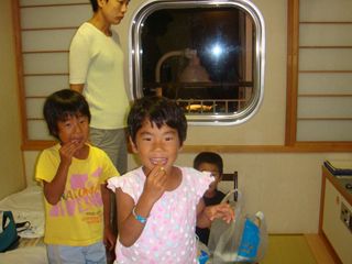 船の朝はバイキング。大人1000円・子供800円。昼は自販のおにぎり・焼きそば・ポテト。夜は定食。風呂にも2回。船内は、売店、ゲーセン、マッサージ、映画まで。海が穏やかだったので、全く揺れず。快適。